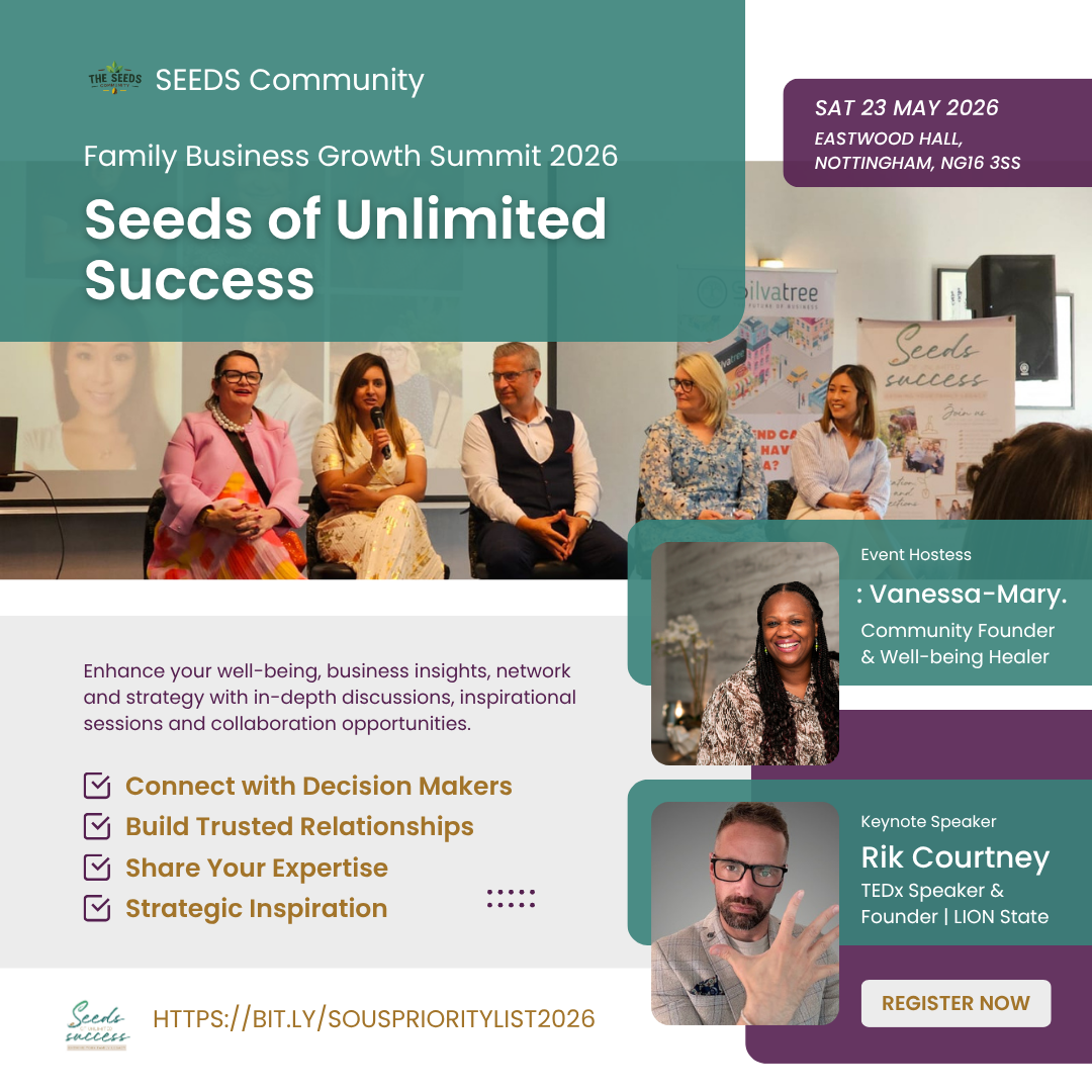 At the Seeds of Unlimited Success, Family Business Growth Summit, you’ll connect with like-minded leaders, gain practical insights from respected speakers, and step into a supportive community built to help your family business thrive.